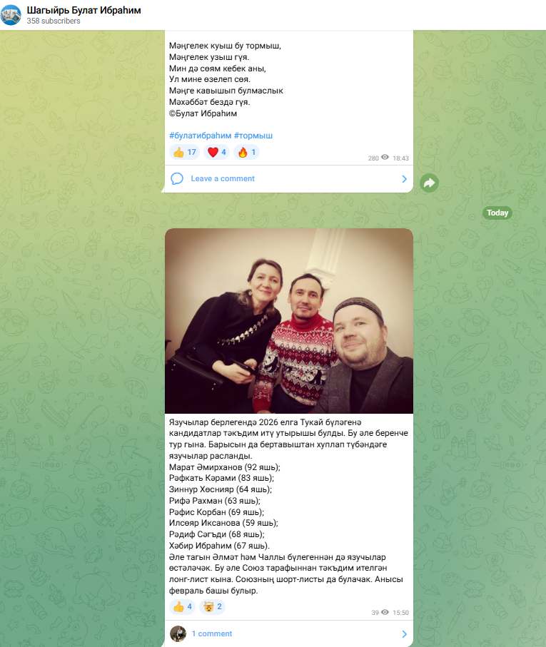 Язучылар берлегендә 2026 елга Тукай бүләгенә кандидатлар тәкъдим иткәннәр. Бу турыда шагыйрь Булат Ибраһим телеграм-каналында яза.