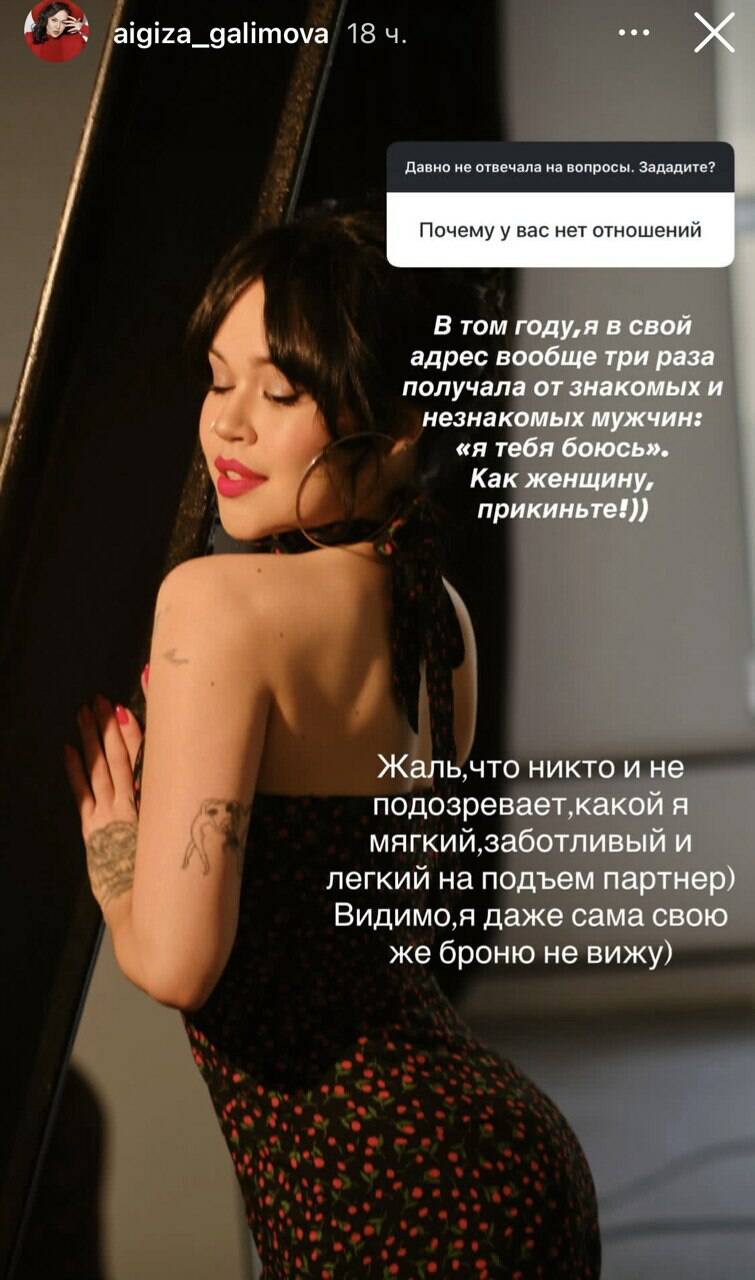 Татарстанның һәм Башкортстанның халык артисты Айдар Галимовның кызы Айгизә Галимова ир-атларның үзенә карата мөнәсәбәте турында язган. Аңа социаль челтәрдә: «Нигә сез мөнәсәбәтләрдә түгел?» – дигән сорау биргәннәр.