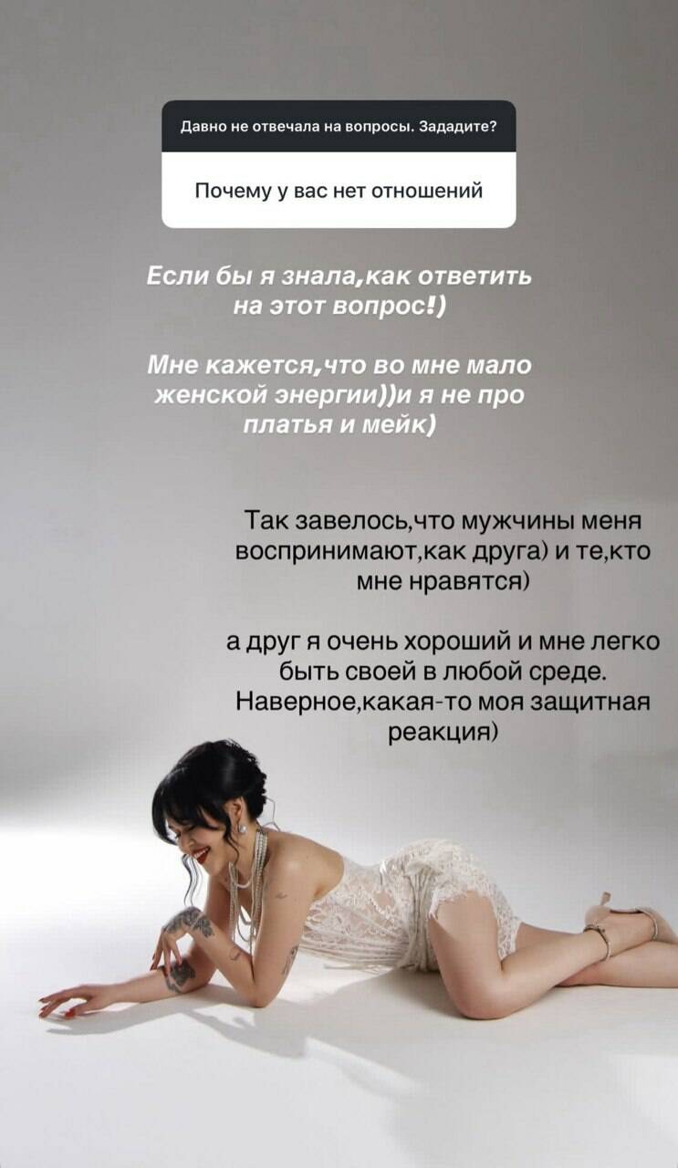 «Бу сорауга ничек җавап бирергә белсәм иде! Миңа калса, миндә хатын-кыз энергиясе аз кебек, һәм сүз күлмәкләр яки макияж турында бармый. Ир-атлар мине дус итеп кенә кабул итә, үземә ошаганнары да. Дус буларак мин бик яхшы. Бу, мөгаен, ниндидер саклану реакцияседер.