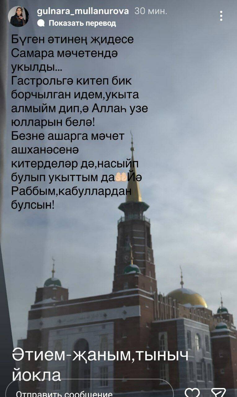 «Бүген әтинең җидесе Самара шәһәрендә укытылды. Гастрольгә киткәнгә, укыта алмыйм дип, бик борчылган идем. Ә Аллаһ үзе юлларын белә. Безне ашарга мәчет ашханәсенә китерделәр дә, насыйп булып укыттым да. Йә, Раббым, кабуллардан булсын!