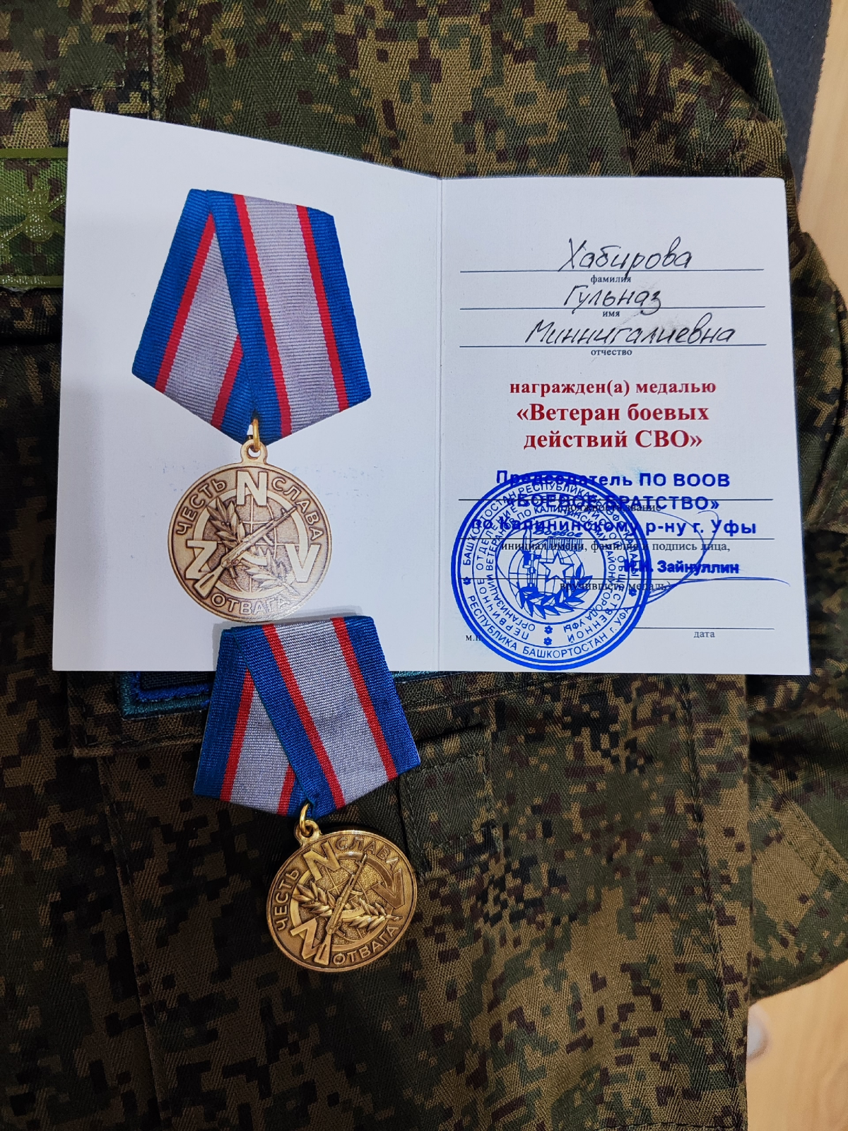 Шәфкать туташының намуслы хезмәте хәрби җитәкчелекнең Мактау грамоталары белән дә билгеләнгән. Аннары ул «Махсус хәрби операция ветераны» дигән медаль белән дә бүләкләнгән.