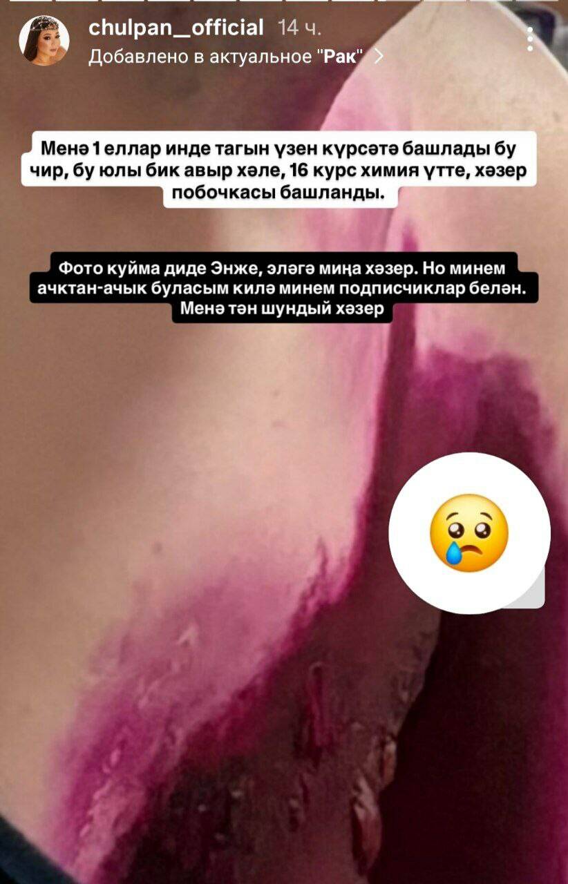 Менә 1 еллар инде тагын үзен күрсәтә башлады бу чир. Бу юлы хәле бик авыр. 16 курс химиотерапия үтте, «побочка»лары башланды. Фотолар куйма, дигән иде Энҗе, эләгер инде миңа. Әмма минем язылучыларым белән ачык буласым килә. Сеңлемнең тәне менә шундый хәзер, – дип фотолар күрсәтә Чулпан Йосыпова.