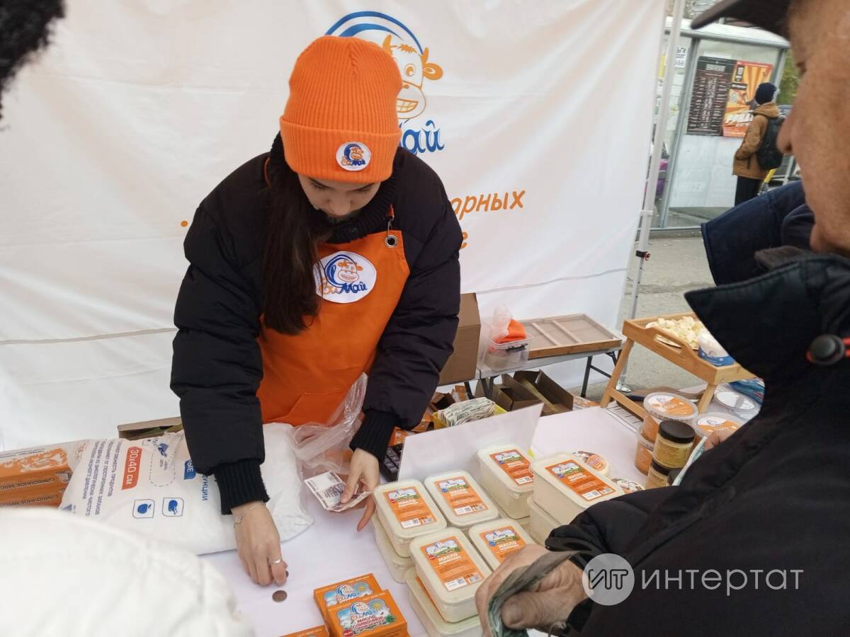 Узган шимбәдә Казанның Юлиус Фучик урамындагы көзге авыл хуҗалыгы мәйданына юл тоттык. Һәм әллә кайдан ук игътибарны бер сәүдә ноктасына «су буедай» чират җәлеп итте. Әллә инде берәр нәрсә тараталармы, дип барсак – Биектауның «ЕлМай» сөт комбинаты товарларын саталар икән.