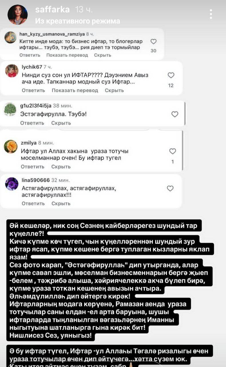 «Әй, кешеләр, ник соң сезнең кайберләрегез шундый тар күңелле? Күпме көч түгеп, чын күңелләреннән зур ифтар ясап, күпме кешене бергә туплаган кызларны яклап язам.