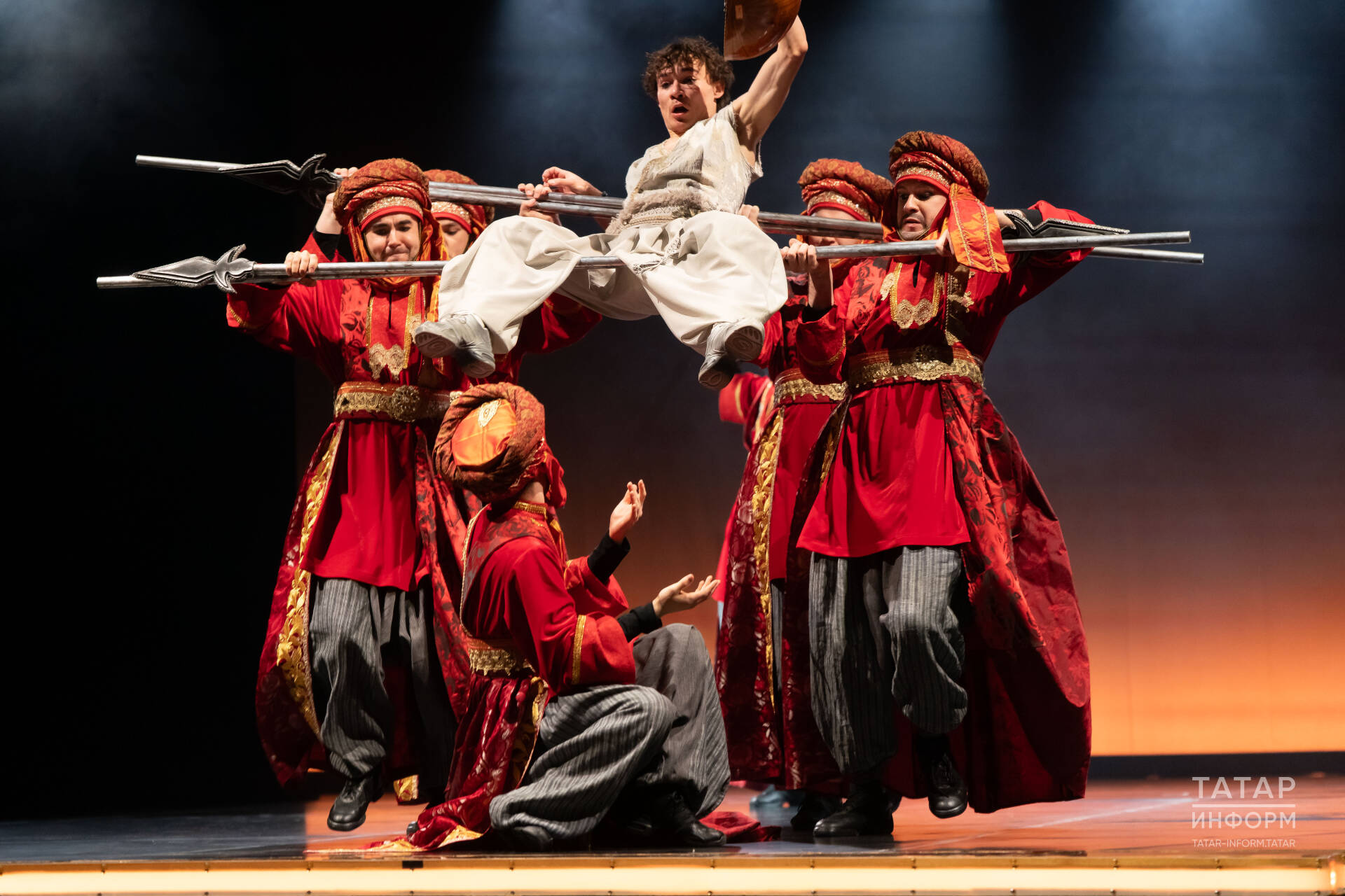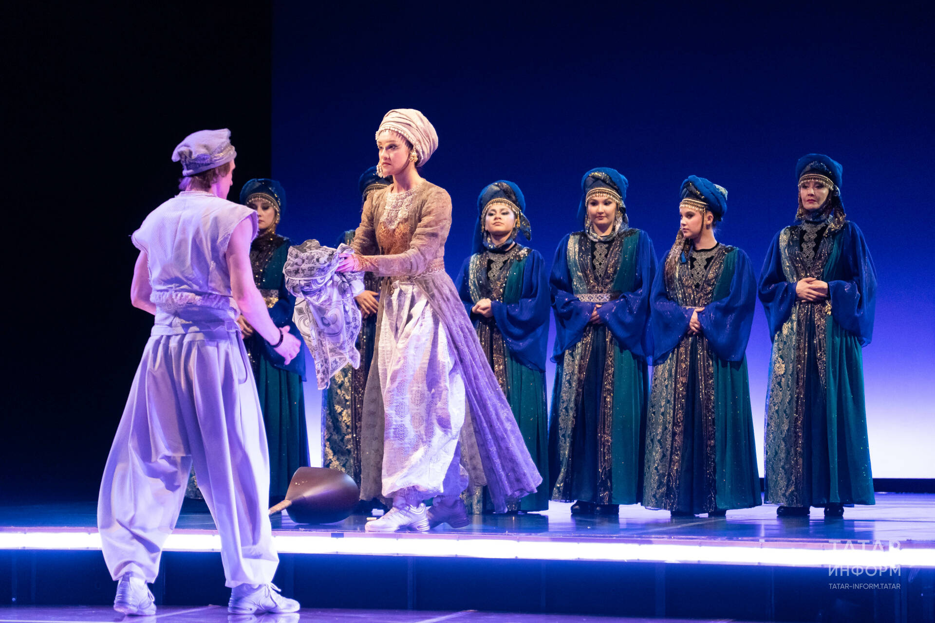 Декорацияләр, дөресрәге, костюмнар бик зиннәтле тукымалардан бай итеп эшләнгән. Түгәрәк сәхнәгә ниндидер декорацияләр кирәк тә түгел һәм алар юк та, ефәк-парча киемнәр үзләре үк шәрыкъ әкиятенә алып керә. Сәхнәдә өзлексез хәрәкәт. Түгәрәк сәхнә әйләнә: ул әйләнә – вакыт ага. Азакка таба егетне сөйгәне янына алып кайтучы ак аргамак барлыкка килә – спектакльне визуаль яктан тасвирлап бетерә торган түгел һәм ул дөрес тә булмас, аны үзегез күрергә тиеш.