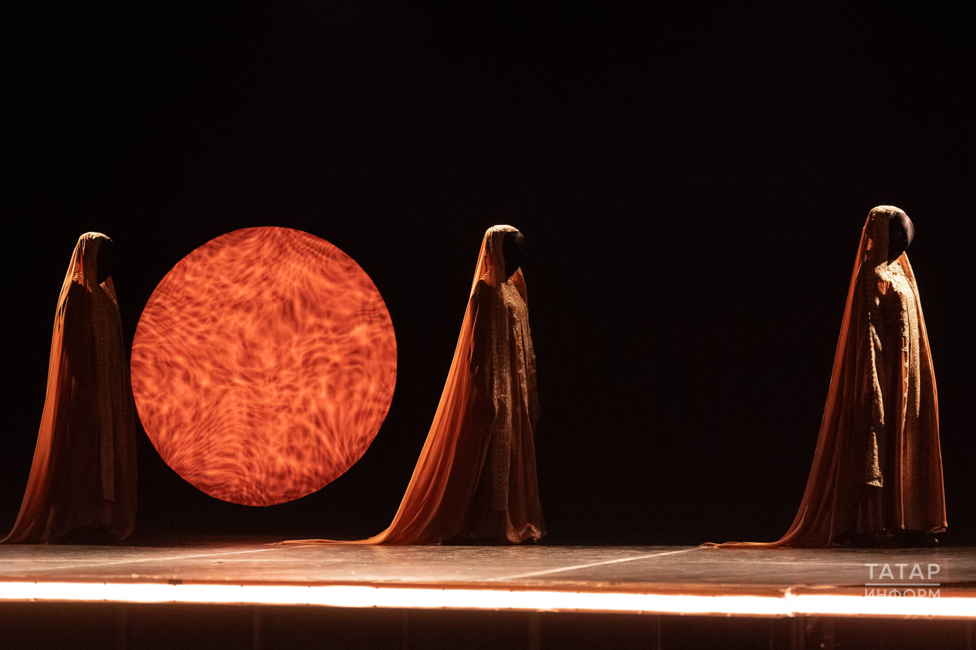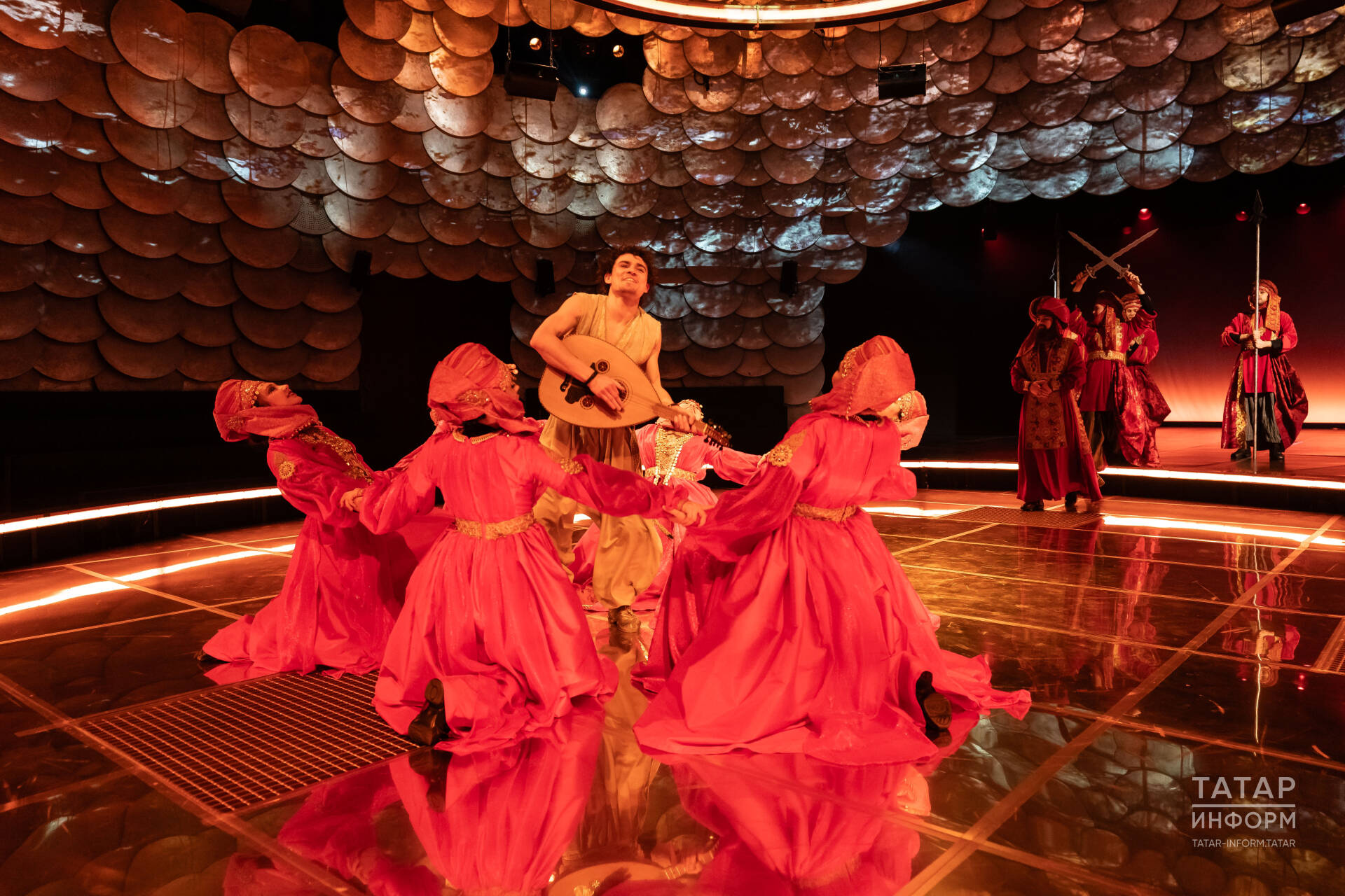 Менә Камал театрының түгәрәк залына уздык, түгәрәк сәхнә тирәли түгәрәкләнеп утырдык. Либретто өчен буклет та бар. Анда иҗат командасының һәм катнашучы артистларның (массовкадагы артистларны да кертеп) фоторәсемнәрен эре итеп куеп, затлы кәгазьгә матур гына ясалган. Күрсәтеләсе вакыйгалар турында ике телдә җентекләп язылган.