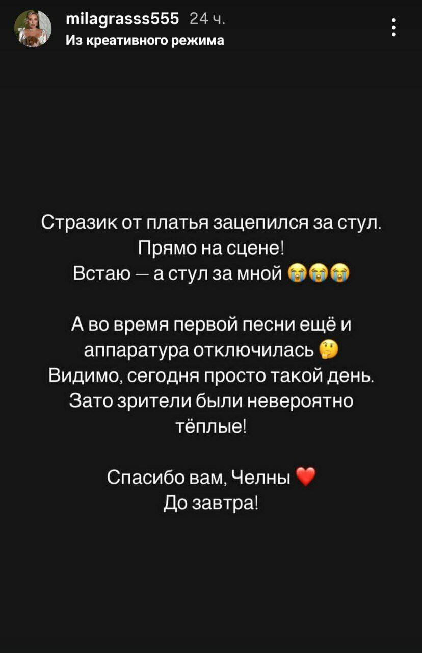 Ләкин артист тормышының төрле ягы бар шул. Кичәге концерттагы чыгышында Миләүшә көтелмәгән хәлгә юлыккан. Бу хакта ул үзенең сторисларында сөйләде.