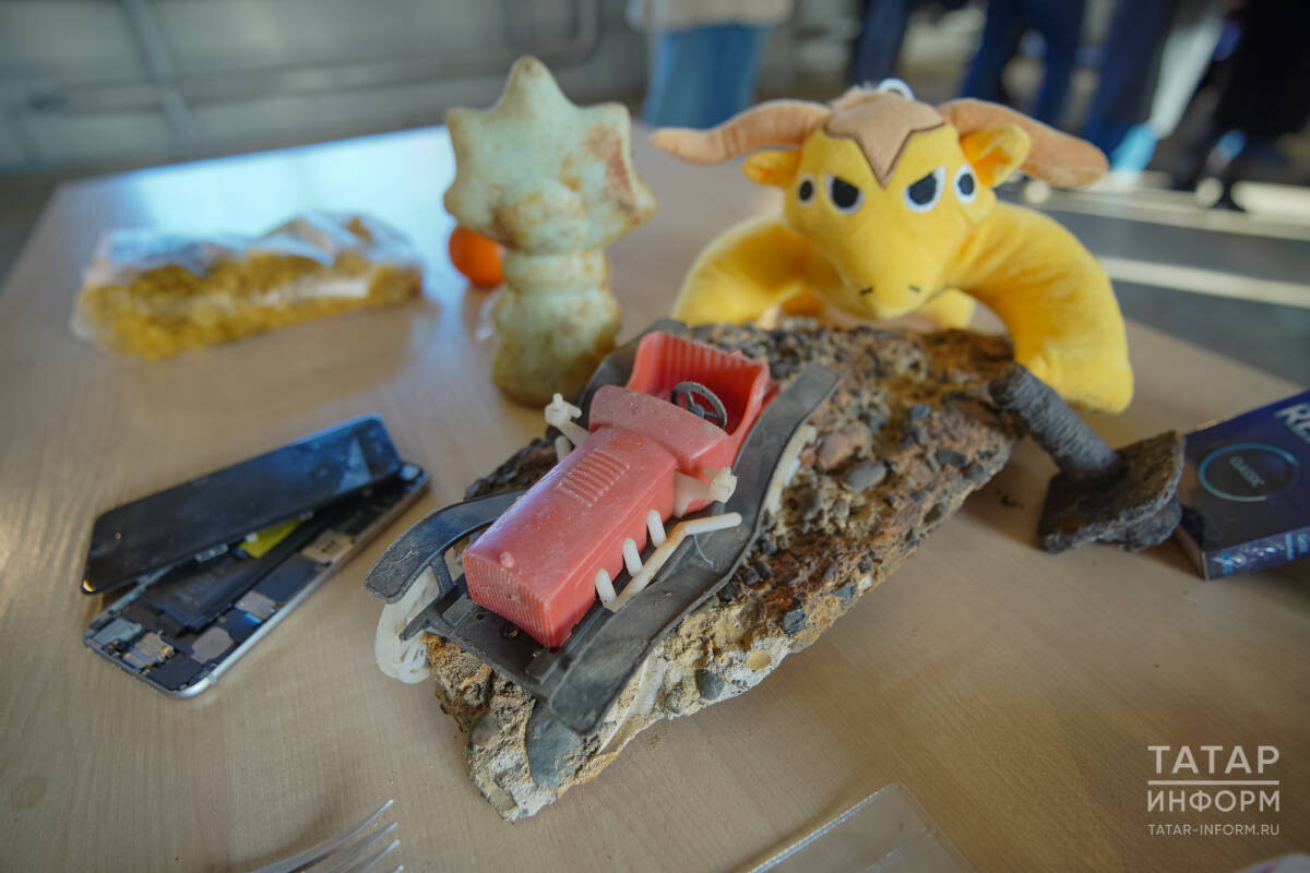 Журналистларга агынты суларда табылган әйберләр дә күрсәтелде. Өстәлгә 200, 100, 50 һәм 5 сумлык кәгазь акча кисәкләре, чәнечке, кәрәзле телефон, бер кап макарон, помидор, мандарин, каралып беткән «Кар кызы» уенчыгы һәм башка төрле чүпләр тезелгән. Бу табылдыкларны «Водоканал» директоры Рөстәм Абдулхаков тәкъдим итте.