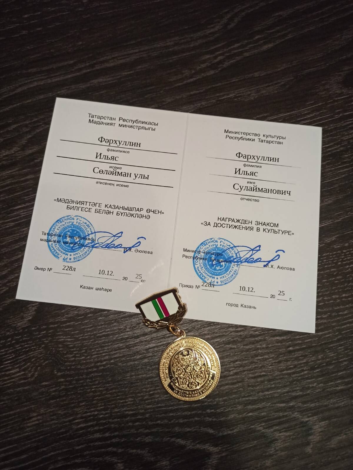 Җырчы, музыкант Ильяс Фәрхуллин Татарстан Республикасы Мәдәният министрлыгының «Мәдәнияттәге казанышлар өчен» күкрәк билгесе белән бүләкләнгән. Бу хакта ул «ВКонтакте» сәхифәсендә хәбәр итә.