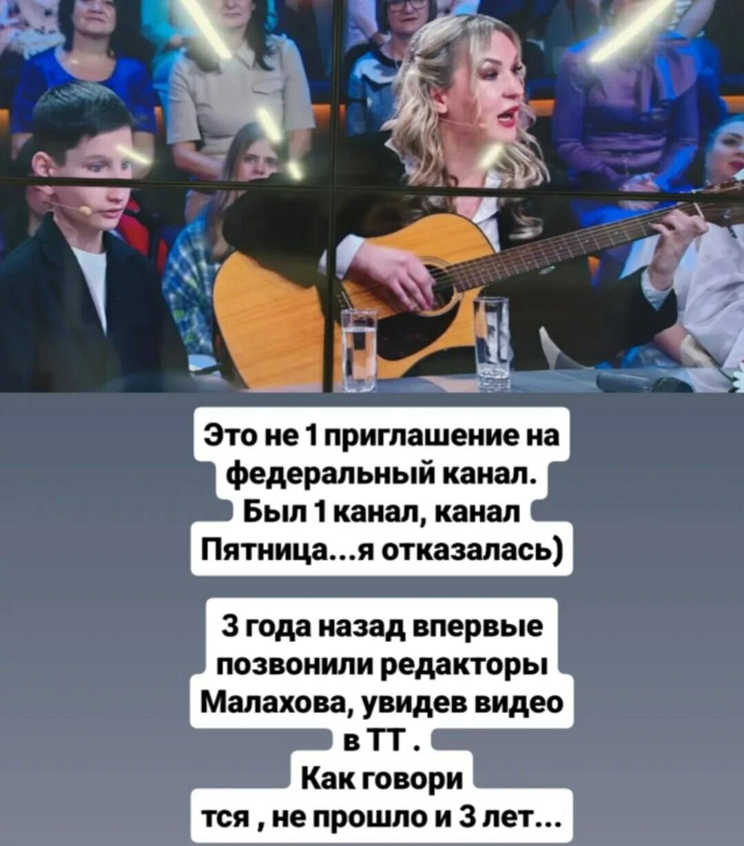 Федераль телеканалларга беренче генә чакырылуым түгел. Моңа кадәр тапшыруларның форматы туры килми иде. Ниһаять, Малаховта кунакта чын күңелдән җырладык», – дип яза ул бу турыда.