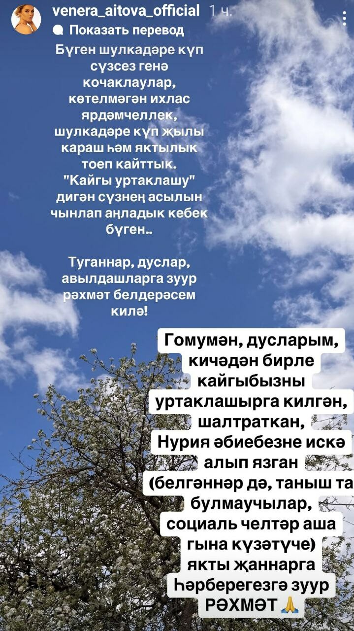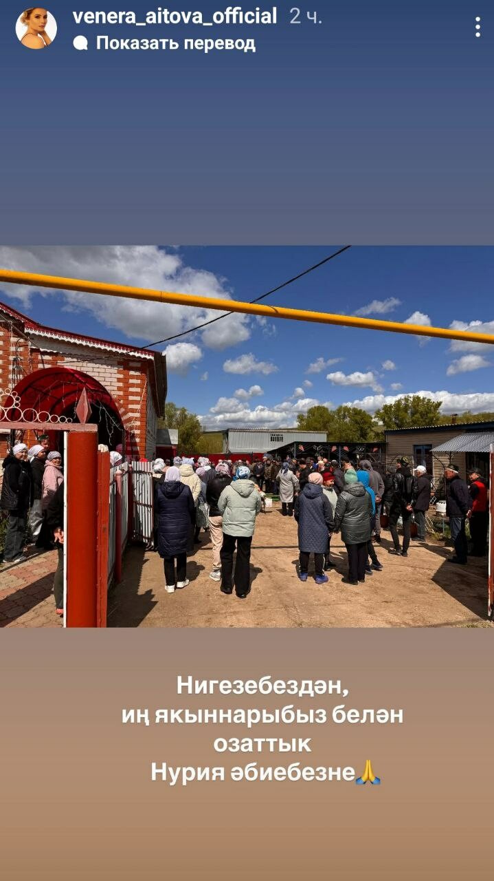 «Нигезебездән иң якыннарыбыз белән озаттык Нурия әбиебезне. Бүген шулкадәр күп сүзсез генә кочаклаулар, көтелмәгән ихлас ярдәмчеллек, шулкадәрле күп җылы караш һәм яктылык тоеп кайттык. «Кайгы уртаклашу» дигән сүзнең асылын чынлап аңладык кебек бүген. Туганнар, дуслар, авылдашларга зур рәхмәт белдерәсем килә. Гомумән, дусларым, кайгыбызны уртаклашырга килгән, шалтыраткан, Нурия әбиебезне искә алып язган (белгәннәр дә, таныш та булмаучылар, социаль челтрә аша гына күзәтүче) якты җаннарга һәрберегезгә зур рәхмәт», – дип яза ул.