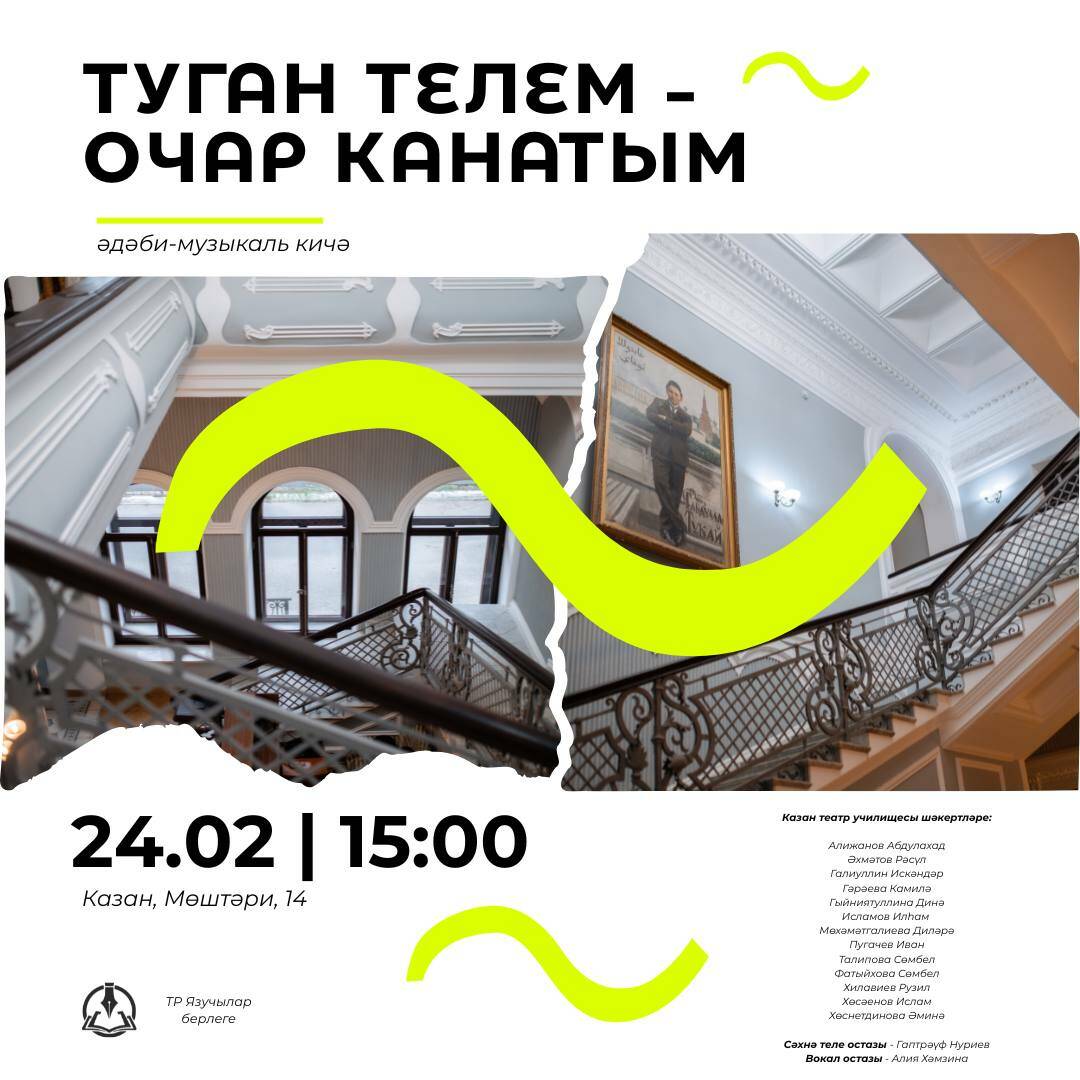 Татарстан Язучылар берлеге Казан театр училищесы шәкертләре катнашында «Туган телем - очар канатым» исемле әдәби-музыкаль кичәгә чакыра. Халыкара туган телләр көненә багышланган бу кичә 24 февральдә була. 15:00 сәгатьтә башлана. Керү ирекле.