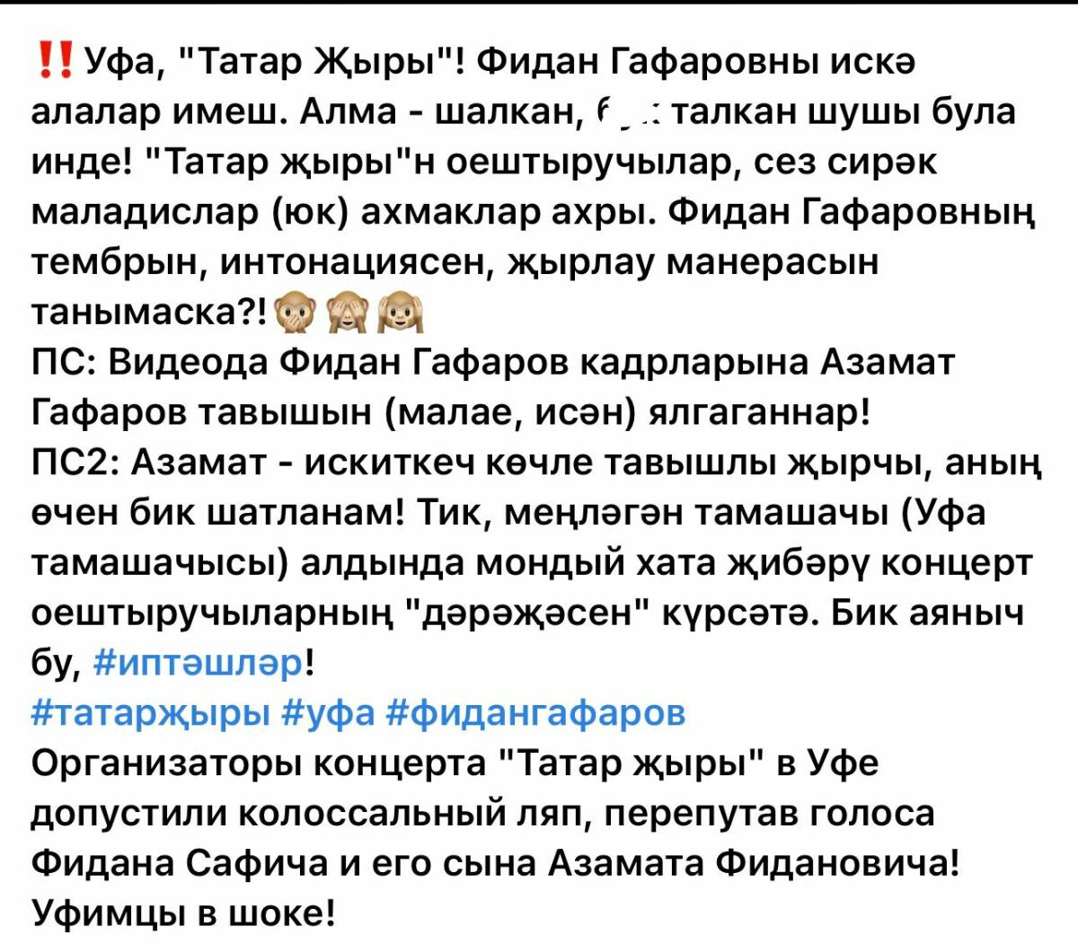Оештыручылар сорауларга җавап бирергә һәрвакыт әзер. Шул ук вакытта журналистлар белән элемтәдә булучыга мөрәҗәгать иттем һәм җавап алдым. Команда, бу шелтәне кире кагып, кайсы композицияне видеотасмага беркетүләрен җибәрде. Шушы җыр белән видеодагы музыканың туры килүен аңлап, мин дә Нур Алиевның ялгышуын аңладым. Әгәр дә Нур хаклы булса, димәк, оештыручылар үзләре дә алданган булып чыга, чөнки интернеттагы бу композиция Фидан Гафаров башкарган җырлар тупланган альбомнан алынган. Сүз уңаеннан, концертның бу өлеше иң сентименталь урын булды. Җыры да шундый. Фидан Гафаровның рухына дога булып ирешсен.