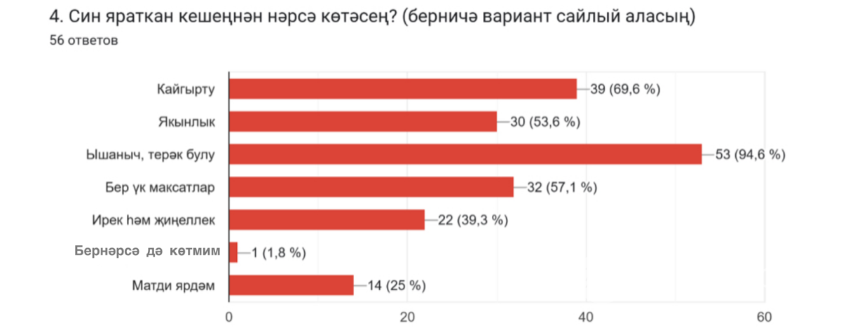 Сораштыруда катнашучыларга без «Син яраткан кешеңнән нәрсә көтәсең?» дигән сорау бирдек. Әлеге сорауда кешеләргә берничә вариант сайлап алу мөмкинлеге бирелде. Иң күп сайланылганнары – ышаныч һәм терәк булу (94,6 %), кайгырту (69,6 %), бер үк максатлар (57,1 %) һәм иң азы – бернәрсә дә көтмим, дигән вариант булды.