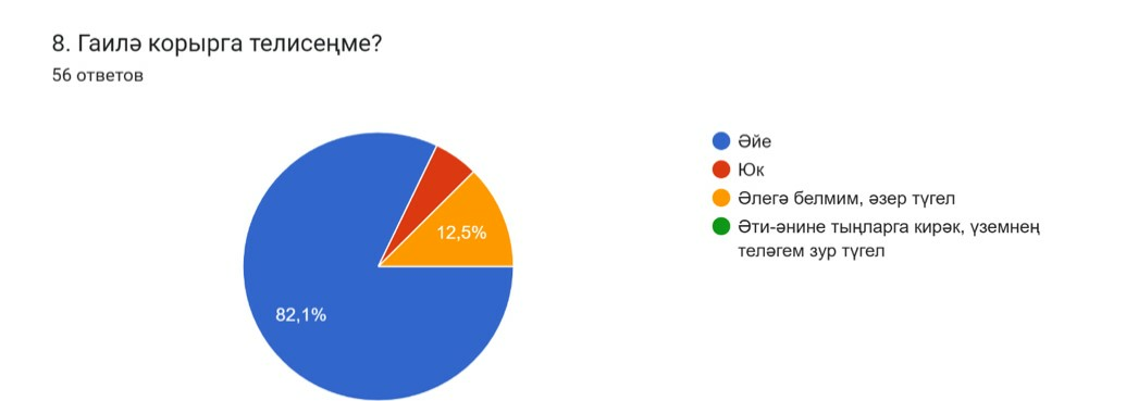 Сораштыру мөнәсәбәтләр турында гына иде. Шулай да гаилә турында да сорарга булдык. Чөнки җитди мөнәсәбәтләр кайчан булса да гаилә коруга китерергә тиеш. Күпчелек (82,1 %) «Гаилә корырга телисеңме?» дигән сорауга «әйе» дип җавап бирде. Шунысы сөендерде, яшьләрнең романтик мөнәсәбәтләргә сак караш булса да, гаилә кыйммәтләре әле беренче урында тора икән. 12,5%ы әлегә әзер булмаганын белдерде. Калган 5,4% гаилә корырга теләми.