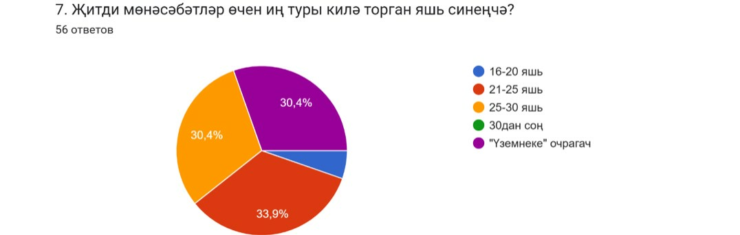Күпчелек (33,9 %) туры килә торган вакытны 21-25 яшь дип билгеләде. Димәк, алар үзләрен бу чорда җитлеккән, җаваплылык алырга әзер итеп тоя.