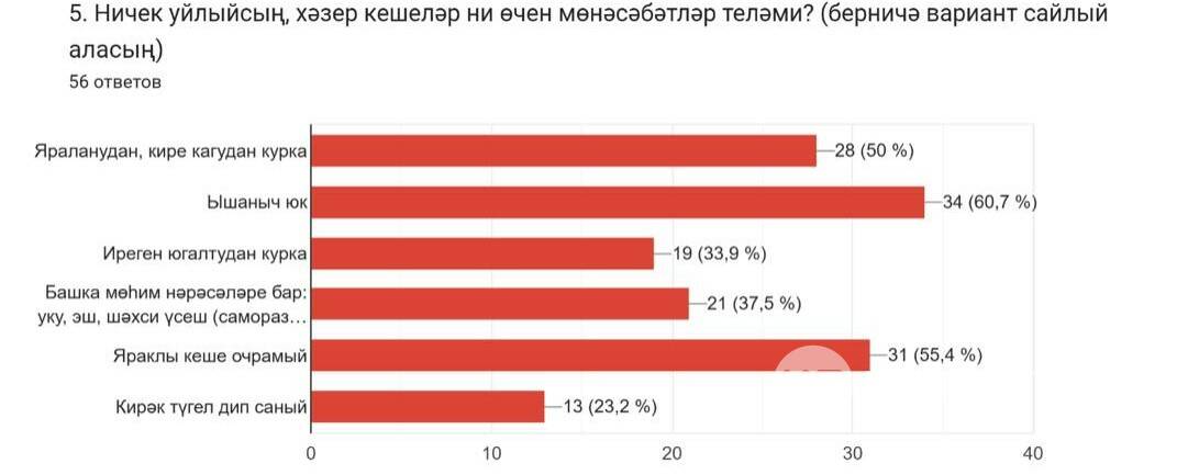 Чираттагы сорау белән кешеләрнең ни өчен мөнәсәбәтләр теләмәгәнен ачыкларга теләдек. Яшьләр без тәкъдим иткән вариантларның берничәсен сайлый ала иде. Җаваплар түбәндәгечә булды: