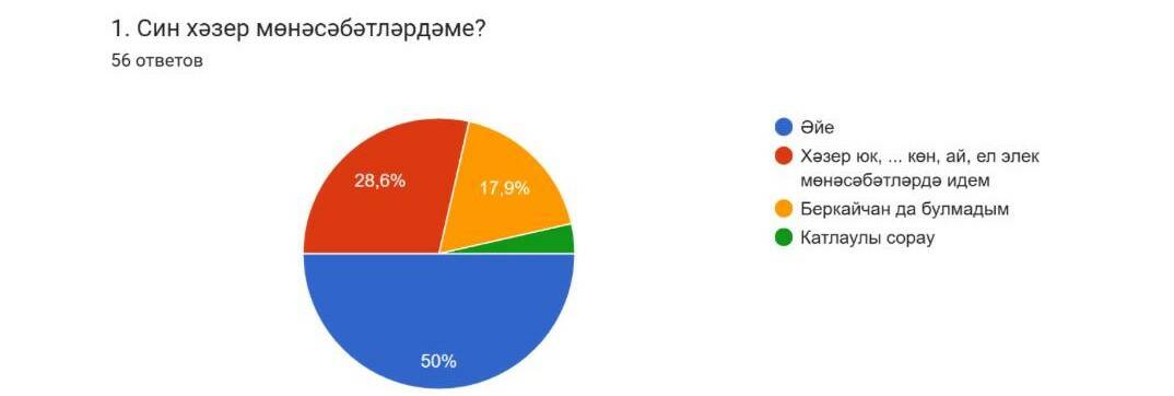 «Интертат» оештырган аноним сораштыруда 56 кеше катнашты. Аларның уртача яше – 24-25 яшь булды. Шуларның 50 проценты бүгенге көндә үз парларын тапкан, 28,6 проценты – ниндидер сәбәпләр аркасында сөйгән ярларыннан аерылган, 17,9 проценты беркайчан да мондый мөнәсәбәтләргә кермәгән. Калганнар өчен бу сорау катлаулы булды.