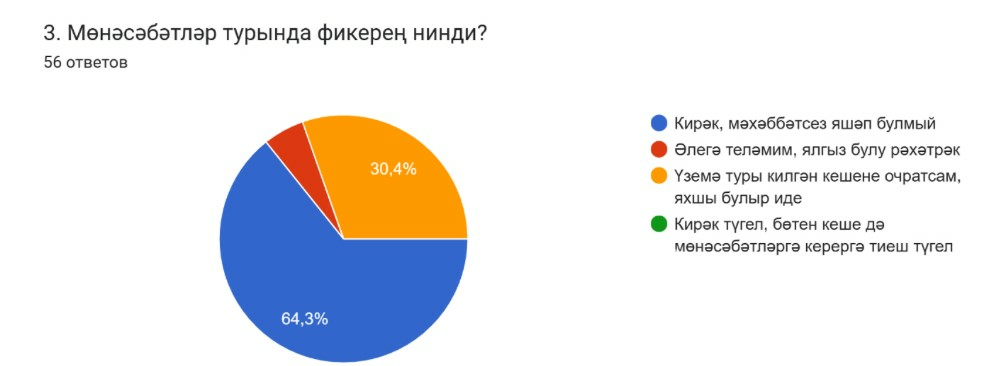 Яшьләрдән мөнәсәбәтләр турында фикерләрен сорадык. 64,3 проценты – «кирәк, мәхәббәтсез яшәп булмый» дип саный. 30,4 проценты – «үземә туры килгән кешене очратсам, яхшы булыр иде», ди. Калганы «әлегә теләмим, ялгыз булу рәхәтрәк» дигән варианты сайлаган.