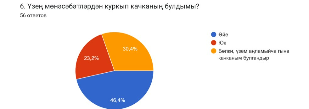 Үзең мөнәсәбәтләрдән куркып качканың булдымы? Киләсе соравыбыз шулай яңгырады. Яшьләр арасында мөнәсәбәтләрдән качмыйча калганнары 23,2% булды. Калганнарының тормышларында мондый «уңайсыз» күренеш булгалаган.