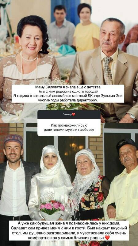 Салаватның әнисен балачактан ук белә идем (без бер шәһәрдән). Мин мәдәният йортына вокаль ансамбльгә йөрдем, ә анда Зөлхия әни озак еллар директор булып эшләде. Ә кәләш буларак өйләрендә таныштым. Салават мине кунакка алып кайтты. Тәмле итеп табын әзерләнгән иде, без җанлы итеп сөйләшеп утырдык. Мин аларда үземне якын кешеләремдә кебек рәхәт тойдым.