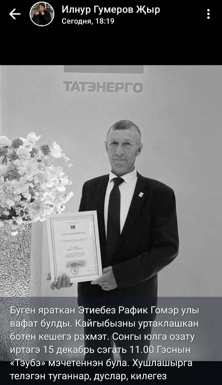 «Бүген яраткан әтиебез Рафик Гомәр улы вафат булды. Кайгыбызны уртаклашкан бөтен кешегә рәхмәт. Соңгы юлга озату иртәгә 15 декабрьдә 11.00 сәгатьтә «Тәүбә» мәчете янында була. Хушлашырга теләгән туганнар, дуслар, килегез», – дигән артист.